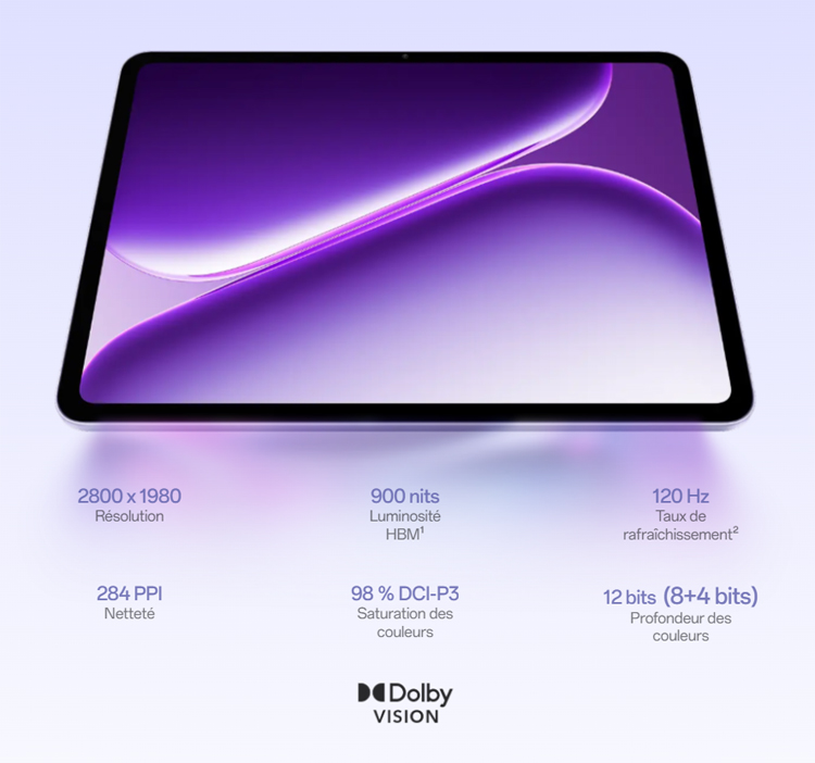 La dalle affiche une densité de 284 pixels par pouce et couvre 98 % de l’espace colorimétrique DCI-P3, gage de couleurs riches et fidèles. Sa luminosité maximale atteint 900 nits en mode HBM, assurant une bonne lisibilité même dans des environnements lumineux. Compatible Dolby Vision et certifiée TÜV Rheinland Intelligent Eye Care 4.0, elle se veut aussi respectueuse du confort visuel sur de longues sessions, un point clé pour les étudiants et les professionnels mobiles. Le ratio écran/boîtier de 88,5 % renforce enfin l’impression d’immersion, qu’il s’agisse de regarder une série, de lire ou de travailler sur plusieurs applications.