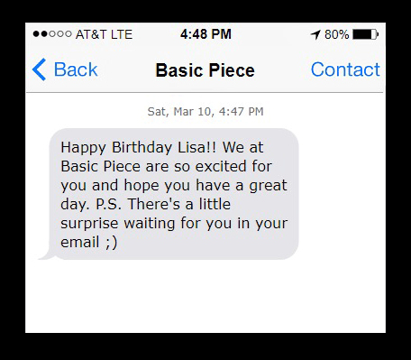 Les SMS exigent une occasion spéciale. Montrez à votre client que vous vous souciez d'une offre qui dure quelques jours autour de son anniversaire. Vous pouvez soit mettre l'offre directement dans votre message SMS, soit l'envoyer en tant que teaser pour vérifier leur e-mail pour recevoir un cadeau Quoi que vous décidiez de faire, assurez-vous de suivre un e-mail.
