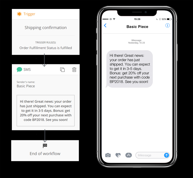 Tout le monde attend un e-mail de bienvenue, mais l'ajout d'un SMS immédiat dans l'envoi sera une surprise pour vos clients. Si vous avez offert une incitation à vous inscrire, envoyez le code de réduction ou le lien par SMS, puis ajoutez à ce SMS, l'envoi d'un e-mail au cas où le SMS ne serait pas suffisant pour inciter le client à acheter.