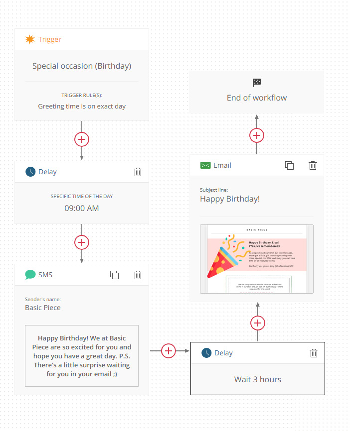 Utilisez un SMS par workflow pour des tâches telles que les workflows de bienvenue, d'anniversaire et d'abandon de panier.